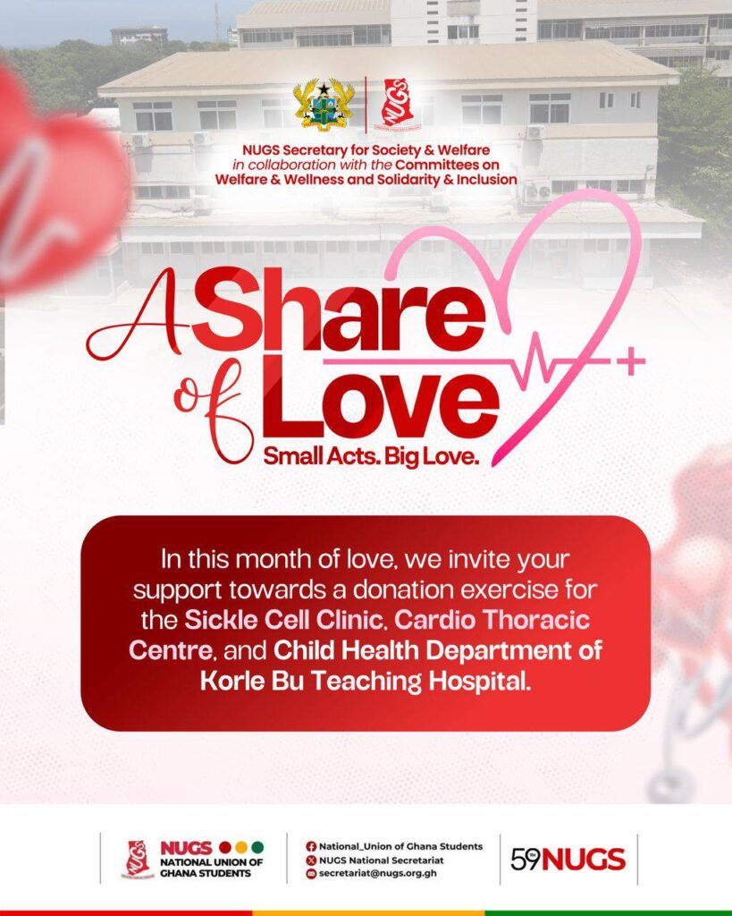 This month of love, the National Union of Ghana Students (NUGS) through the Secretary for Societies and welfare, invites you to support a donation exercise for the Sickle Cell Clinic, Cardiothoracic Centre, and Child Health Department of Korle Bu Teaching Hospital. We are accepting medical equipment, consumables, toiletries, snacks and cash donations to help […]